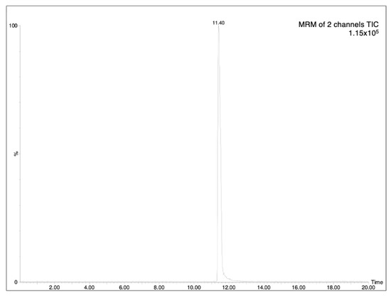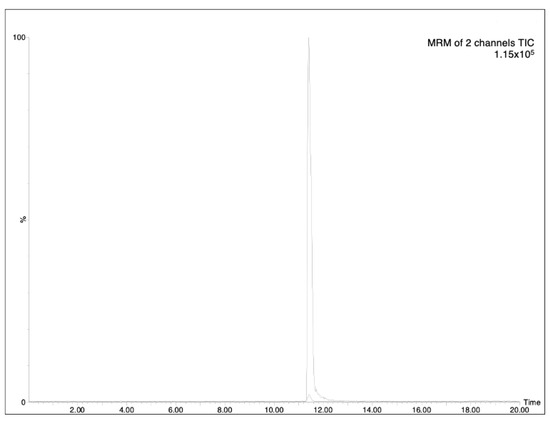 HPLC-MS analysis was performed using a 2695 Alliance separation system (Waters Go, Milford, MA, USA) equipped with a QuattroTM API triple quadrupole mass spectrometer with an electrospray source (Micromass, Water, Manchester, UK). Chromatographic conditions were the following: Column XSelect®HSST3 (250 mm × 2.1 mm, 5 µm), flow rate 0.2 mL/min, column temperature 30 °C, injection volume 10 μL. A gradient profile was applied using water (eluent A) and acetonitrile (eluent B) as mobile phases. Initial conditions were set at 100% A, after 5 min of the isocratic step, a linear change to 100% B at 8 min, and holding for 5 min before returning to initial conditions. Columns recondition was achieved over 6 min, providing a total run time of 20 min. The column was maintained at 30 °C and a flow rate of 0.20 mL/min was used. MSD parameter: ESI negative, capillary voltage 2.5 kV, cone voltage 25 V, extractor voltage 2, source block temperature 120 °C, desolvation temperature 350 °C. Cone-gas-flow nitrogen and argon were used as the collision gas. Detection was performed using multiple reaction monitoring (MRM) by monitoring two transitions; the parent peak was 187, which corresponds to the ion [M-H]−, the first transition was m/z 125 [M-OHOCO]−, with collision energy 17, and the second one m/z 97 [M-(OHOCO)2]−, with collision energy 20. The first transition reported was used as a quantification, while the second was used as a qualifier.