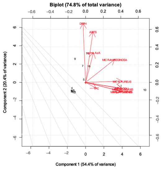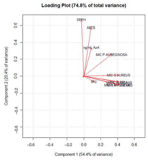 As highlighted in Figure 4, PC1 mainly describes the extraction treatments; in particular, water extracts rich in AzA are separated from the others, with hydroalcoholic and water-extracted samples with low AzA content (in fluid state) with negative scores (left-hand side of the plot) and water samples rich in AzA with positive scores (right-hand side of the plot). On the other hand, it is clear that the samples are separated along the PC2 according to their bioactivity. Figure 5 displays the loading plot of the PCA. It is evident that variables such ABTS, DPPH and AzA concentration are highly correlated, and it is also easy to overview the relationship among the MIC values, except the MIC of P. aeruginosa which lies between antioxidant activity and the other MIC values. Analysis of the biplot (Figure 6) allowed us to identify variables which best discriminate among extraction techniques and sample matrices. For instance, AzA concentration, DPPH and ABTS clearly separate the fluid Naviglio sample and the fluid hydroalcoholic maceration from all the others. Seven samples are separated in the biplot. Sample 1 (the fluid sample obtained by water maceration from wheat grain), lies on the right side of the box plot and is characterized by good antimicrobial activity and moderate AzA concentration. Sample 7 (hydroalcoholic maceration) is the only one with a good MIC value against P. aeruginosa (as can be depicted by its position on the biplot). Sample 9 (fluid extract obtained using Naviglio technology, from wheat grain), presented the highest content of AzA, and it is located on the upper side of the plot. The sample with the best antimicrobial properties and AzA content was number 5 (fluid samples obtained from hydroalcoholic solution using ultrasound-assisted technology from wheat grain); in fact, it is located beyond the values. In addition, samples 14 and 16 (fluid samples obtained using hydroalcoholic maceration and ultrasound-assisted technology, respectively, from wheat flour), presented good antimicrobial properties, except against P. aeruginosa and moderate-to-low AzA content.