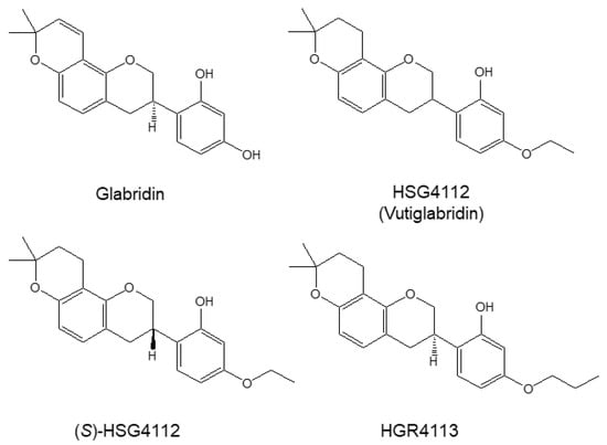 Structures of glabridin and the synthetic glabridin derivatives: HSG4112, (S)-HSG4112, HGR4113. Chemical structures of glabridin and the synthetic glabridin derivatives: Glabridin, HSG4112, (S)-HSG4112, HGR4113.