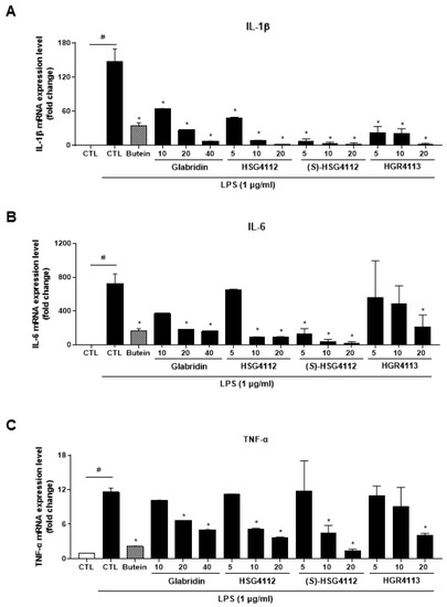 Effects of compounds on LPS-induced IL-1β, IL-6, TNF-α expression in RAW264.7 cells. RAW264.7 cells were pre-treated with or without the indicated concentrations of compounds for 3 h and then stimulated with LPS (1 μg/mL) for 6 h. Butein (10 μM) was used as positive control with known inhibitory effect against LPS-stimulation (hatched pattern column). CTL groups were not treated with any compounds nor LPS (white column). The mRNA levels of (A) IL-1β, (B) IL-6, and (C) TNF-α were determined by qPCR. Values shown are means ± SD of three independent experiments. # p < 0.05 in LPS-treated CTL vs. CTL, and * p < 0.05 vs. LPS-treated CTL group.