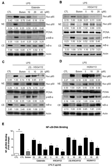 Effects of compounds on LPS-induced NF-κB nuclear translocation and DNA binding in the nucleus in RAW264.7 cells. RAW264.7 cells were pre-treated with or without the indicated concentrations of compounds for 3 h and then stimulated with LPS (1 μg/mL) for 1 h. Butein (10 μM) was used as positive control with known inhibitory effect against LPS-stimulation (hatched column). CTL groups were not treated with any compounds nor LPS (white column). (A–D) Cytosolic extracts (CE) were isolated and the levels of p-IκB-α and IκB-α in each fraction were determined by Western blot. Nuclear extracts (NE) were isolated and the levels of p65 and p50 in each fraction were determined by Western blot. (E) NF-κB ELISA kit (Active Motif) was used on the nuclear extracts to determine the degree of NF-κB DNA binding. PCNA was used as nuclear lysate control and actin was used as cytosolic lysate control. The experiment was repeated three times. The protein expressions in the Western blot were quantitatively presented at the bottom of each band as relative values to the PCNA and actin expression, respectively. Values shown are means ± SD of three independent experiments # p < 0.05 in LPS-treated CTL vs. CTL, and * p < 0.05 vs. LPS-treated CTL group. NE = nuclear extracts, CE = cytosolic extracts.