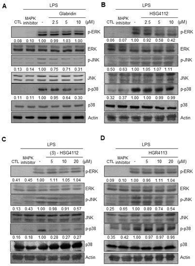 To further investigate the mechanism of the anti-inflammatory effects of the compounds, we examined the effects of glabridin and the synthetic glabridin derivates on MAPK signaling. We examined the activation of the three major MAPK (ERK, JNK, and p38) in RAW264.7 cells by quantifying phosphorylation through Western blot [34]. For the negative control, PD98059, SP600125, and SB203580 were used as inhibitors of ERK, JNK, and p38 MAPK, respectively. LPS stimulation markedly induced the phosphorylation of ERK, JNK, and p38 (Figure 5A–D). Under LPS-stimulation, the tested compounds showed a distinct effect on each of the MAPKS: glabridin suppressed phosphorylation of JNK and p38 (Figure 5A), HSG4112 suppressed phosphorylation of ERK (Figure 5B), (S)-HSG4112 suppressed phosphorylation of JNK and p38 (Figure 5C), and HGR4113 suppressed phosphorylation of JNK (Figure 5D). The total unphosphorylated forms of all MAPKs were unaffected by LPS and test compounds (Figure 5A–D). These results show that while glabridin and the synthetic glabridin derivatives inhibit at least one MAPK signaling under LPS-stimulation, the specific MAPK (ERK, JNK, and p38) involved is distinct for each compound.