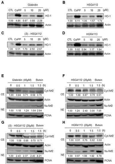 Effects of compounds on HO-1 expression and Nrf2 nuclear translocation in RAW264.7 cells. (A–D) RAW264.7 cells were treated with or without the indicated concentrations of compounds for 12 h. Copper (CoPP) was used as positive control. The protein level of HO-1 was determined by Western blot. CTL groups were not treated with any compounds. The protein expressions in the Western blot were quantitatively presented at the bottom of each band as relative values to the actin expression. (E–H) RAW264.7 cells were treated with the highest non-toxic concentrations of compounds for 0, 0.5, 1, and 1.5 h. Nuclear and cytosolic extracts were isolated and the levels of Nrf2 in each fraction were determined by Western blot. Butein (10 μM) was used as positive control. PCNA was used as nuclear lysate control and actin was used as cytosolic lysate control. The experiment was repeated three times. The protein expressions in the Western blot were quantitatively presented at the bottom of each band as relative values to the PCNA and actin expression, respectively. NE = nuclear extracts, CE = cytosolic extracts.
