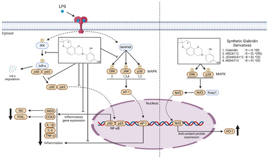 In this study, we investigated the anti-inflammatory and anti-oxidative effects of the synthetic glabridin derivatives in LPS-induced RAW264.7 cells and examined their mechanisms on the major pro-inflammatory MAPK and NF-κB pathways and anti-inflammatory Nrf2 pathway.