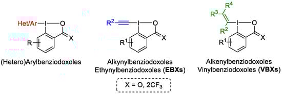 Mironova IA, Noskov DM, Yoshimura A, Yusubov MS, Zhdankin VV. Aryl-, Akynyl-, and Alkenylbenziodoxoles: Synthesis and Synthetic Applications. Molecules. 2023; 28(5):2136. https://doi.org/10.3390/molecules28052136