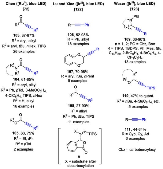 - Zhou, Q.-Q.; Guo, W.; Ding, W.; Wu, X.; Chen, X.; Lu, L.-Q.; Xiao, W.-J. Decarboxylative Alkynylation and Carbonylative Alkynylation of Carboxylic Acids Enabled by Visible-Light Photoredox Catalysis. Angew. Chem. Int. Ed. 2015, 54, 11196–11199. [Google Scholar] [CrossRef]