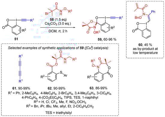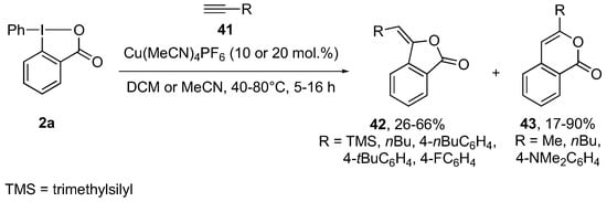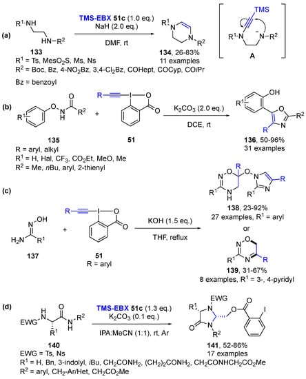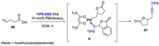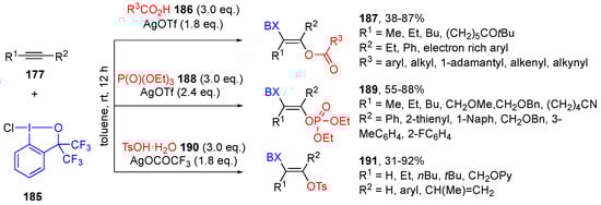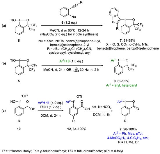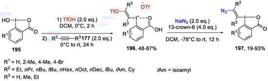 - Wu, B.; Wu, J.; Yoshikai, N. Benziodoxole Triflate as a Versatile Reagent for Iodo(III)cyclization of Alkynes. Chem. Asian J. 2017, 12, 3123–3127. [Google Scholar] [CrossRef] [PubMed]