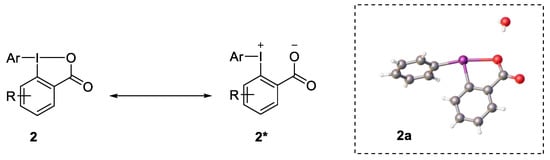 - Yusubov, M.S.; Yusubova, R.Y.; Nemykin, V.N.; Zhdankin, V.V. Preparation and X-ray Structural Study of 1-Arylbenziodoxolones. J. Org. Chem. 2013, 78, 3767–3773. [Google Scholar] [CrossRef]