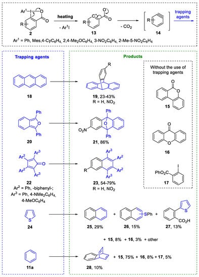 - Yoshimura, A.; Saito, A.; Zhdankin, V.V. Iodonium Salts as Benzyne Precursors. Chem. Eur. J. 2018, 24, 15156–15166. [Google Scholar] [CrossRef] [PubMed]