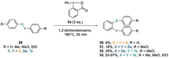 - Petragnani, N.; Toscano, V.G. Reaction of benzyne with ditellurides, diselenides, and disulfides. Chem. Ber. 1970, 103, 1652–1653. [Google Scholar] [CrossRef]