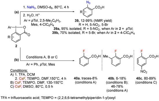 - Yusubov, M.S.; Soldatova, N.S.; Postnikov, P.S.; Valiev, R.R.; Svitich, D.Y.; Yusubova, R.Y.; Yoshimura, A.; Wirth, T.; Zhdankin, V.V. Reactions of 1-Arylbenziodoxolones with Azide Anion: Experimental and Computational Study of Substituent Effects. Eur. J. Org. Chem. 2018, 2018, 640–647. [Google Scholar] [CrossRef]