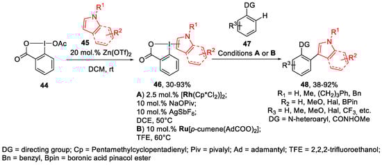 - Caramenti, P.; Nicolai, S.; Waser, J. Indole- and Pyrrole-BX: Bench-Stable Hypervalent Iodine Reagents for Heterocycle Umpolung. Chem. Eur. J. 2017, 23, 14702–14706. [Google Scholar] [CrossRef]