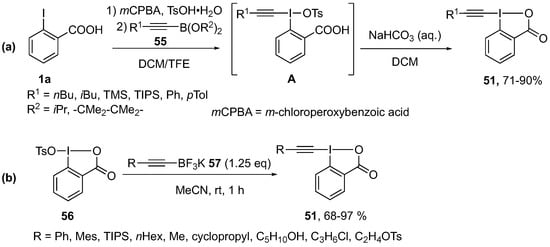 - Ochiai, M.; Masaki, Y.; Shiro, M. Synthesis and structure of 1-alkynyl-1,2-benziodoxol-3(1H)-ones. J. Org. Chem. 1991, 56, 5511–5513. [Google Scholar] [CrossRef]