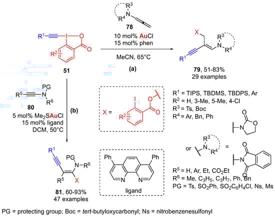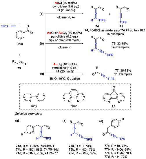 - Banerjee, S.; Bhoyare, V.W.; Patil, N.T. Gold and hypervalent iodine(III): Liaisons over a decade for electrophilic functional group transfer reactions. Chem. Commun. 2020, 56, 2677–2690. [Google Scholar] [CrossRef]