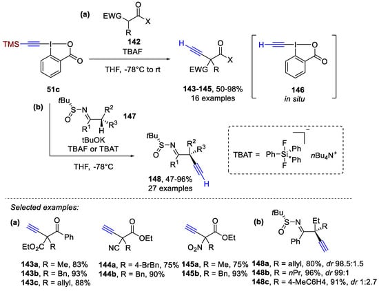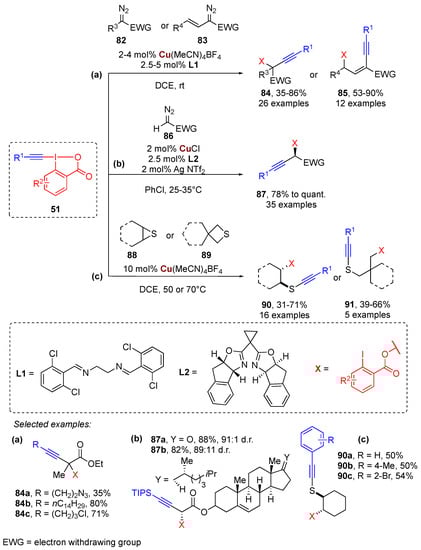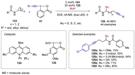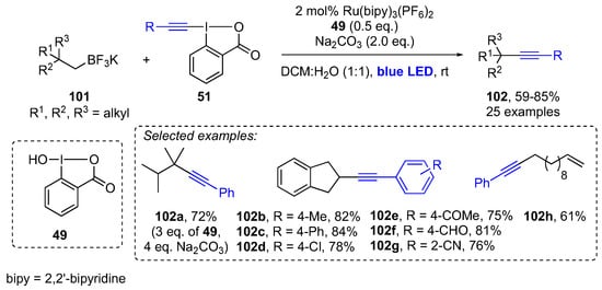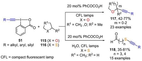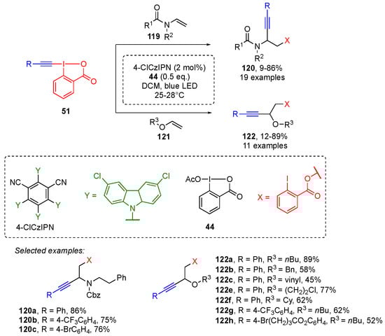 - Le Vaillant, F.; Waser, J. Alkynylation of radicals: Spotlight on the “Third Way” to transfer triple bonds. Chem. Sci. 2019, 10, 8909–8923. [Google Scholar] [CrossRef]
