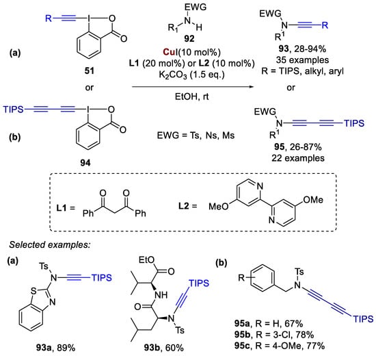 - Suseelan Sarala, A.; Bhowmick, S.; de Carvalho, R.L.; Al-Thabaiti, S.A.; Mokhtar, M.; da Silva, E.N.J.; Maiti, D. Transition-Metal-Catalyzed Selective Alkynylation of C-H Bonds. Adv. Synth. Catal. 2021, 363, 4994–5027. [Google Scholar] [CrossRef]