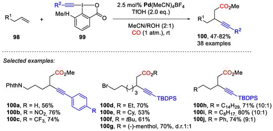 - Pawliczek, M.; Schneider, T.F.; Maass, C.; Stalke, D.; Werz, D.B. Formal anti-Carbopalladation Reactions of Non-Activated Alkynes: Requirements, Mechanistic Insights, and Applications. Angew. Chem. Int. Ed. 2015, 54, 4119–4123. [Google Scholar] [CrossRef] [PubMed]