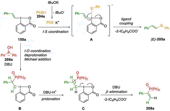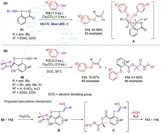 - He, S.-D.; Guo, X.-Q.; Li, J.; Zhang, Y.-C.; Chen, L.-M.; Kang, T.-R. Base-Promoted Reaction of Phenols with Spirocylic λ3-Iodanes: Access to Both 2-Iodovinyl Aryl Ethers and Diaryl Ethers. Eur. J. Org. Chem. 2022, 2022, e202200516. [Google Scholar] [CrossRef]