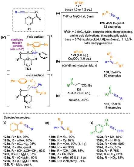 - Castoldi, L.; Di Tommaso, E.M.; Reitti, M.; Graefen, B.; Olofsson, B. Electrophilic Vinylation of Thiols under Mild and Transition Metal-Free Conditions. Angew. Chem. Int. Ed. 2020, 59, 15512–15516. [Google Scholar] [CrossRef] [PubMed]