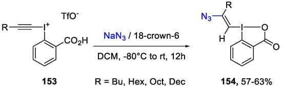 - Mironova, I.A.; Kirsch, S.F.; Zhdankin, V.V.; Yoshimura, A.; Yusubov, M.S. Hypervalent Iodine-Mediated Azidation Reactions. Eur. J. Org. Chem. 2022, 2022, e202200754. [Google Scholar] [CrossRef]