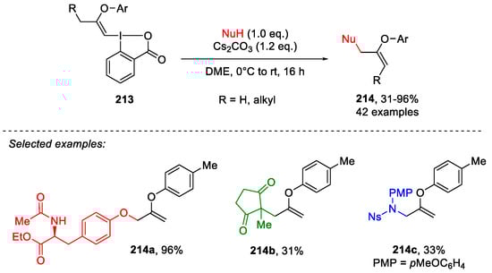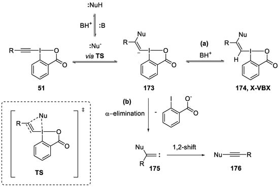 - Di Tommaso, E.M.; Norrby, P.-O.; Olofsson, B. Explaining Regiodivergent Vinylations with Vinylbenziodoxolones. Angew. Chem. Int. Ed. 2022, 61, e202206347. [Google Scholar] [CrossRef]