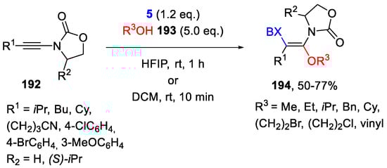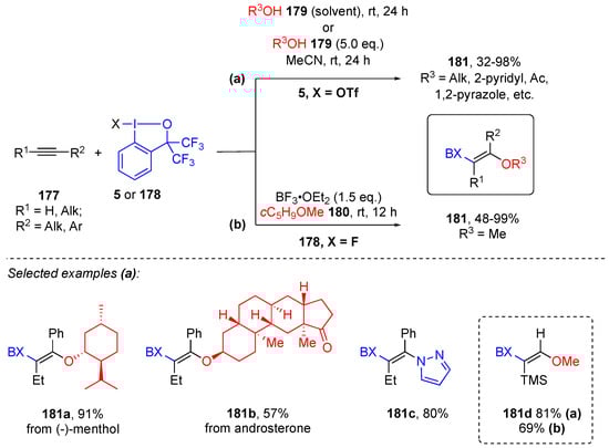 - Chai, J.; Ding, W.; Wu, J.; Yoshikai, N. Fluorobenziodoxole-BF3 Reagent for Iodo(III)etherification of Alkynes in Ethereal Solvent. Chem. Asian J. 2020, 15, 2166–2169. [Google Scholar] [CrossRef] [PubMed]