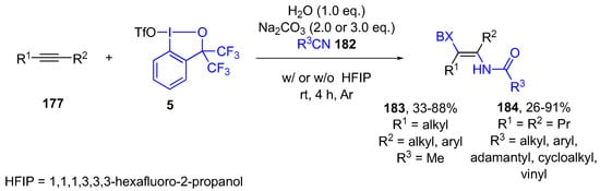 - Chai, J.; Ding, W.; Wang, C.; Ito, S.; Wu, J.; Yoshikai, N. Ritter-type iodo(III)amidation of unactivated alkynes for the stereoselective synthesis of multisubstituted enamides. Chem. Sci. 2021, 12, 15128–15133. [Google Scholar] [CrossRef]