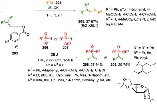 - Castoldi, L.; Rajkiewicz, A.A.; Olofsson, B. Transition metal-free and regioselective vinylation of phosphine oxides and H-phosphinates with VBX reagents. Chem. Commun. 2020, 56, 14389–14392. [Google Scholar] [CrossRef]