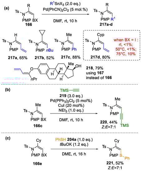 - Caramenti, P.; Declas, N.; Tessier, R.; Wodrich, M.D.; Waser, J. Stereoselective synthesis of alkyl-, aryl-, vinyl- and alkynyl-substituted Z-enamides and enol ethers. Chem. Sci. 2019, 10, 3223–3230. [Google Scholar] [CrossRef] [PubMed]