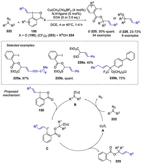 - Pisella, G.; Gagnebin, A.; Waser, J. Copper-Catalyzed Oxyvinylation of Diazo Compounds. Org. Lett. 2020, 22, 3884–3889. [Google Scholar] [CrossRef] [PubMed]