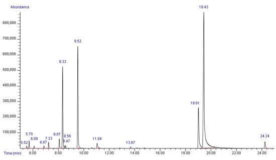 - Adams, R.P. Identification of Essential Oil Components by Gas Chromatography/Mass Spectrometry, 4th ed.; Allured Business Media: Carol Stream, IL, USA, 2012. [Google Scholar]