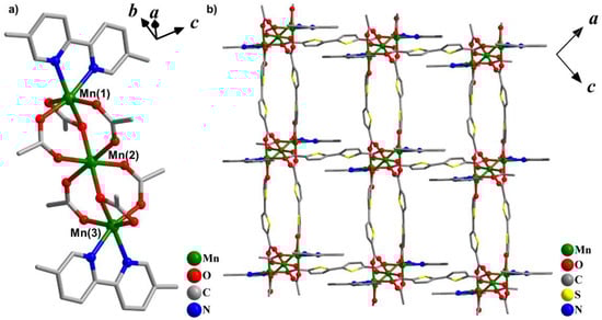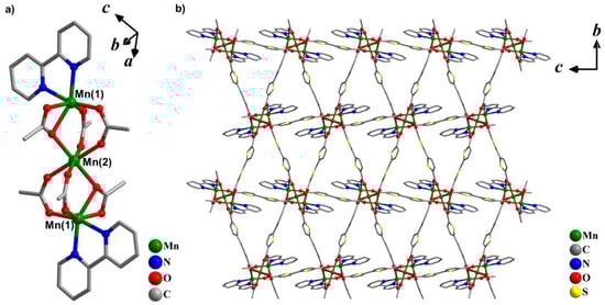 (a) Structure of {Mn3(μ-RCOO-κ1,κ1)4(μ-RCOO-κ1,κ2)2(5,5′-dmbpy)2} building unit in 2; (b) fragment of the layer in Structure 2 (projection on the ac plane).