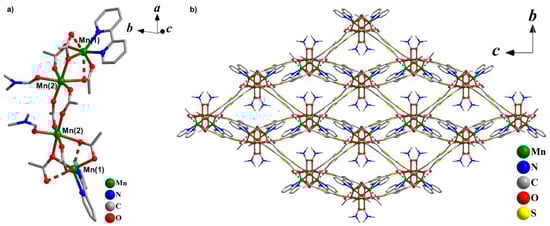 (a) Structure of {Mn4(μ-RCOO-κ1,κ1)6(μ-RCOO-κ1,κ2)2(4,4′-dmbpy)2(dmf)2} building unit in 5; (b) fragment of the layer in Structure 5 (projection on the bc plane).