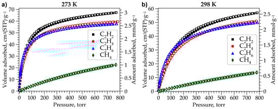 CH4, C2H2, C2H4, and C2H6 gas adsorption isotherms for Compound 1: (a) at 273 K; (b) at 298 K.