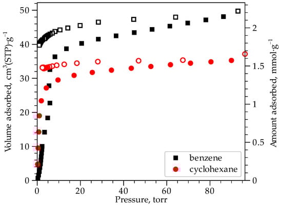 We have also studied adsorption of benzene (C6H6) and cyclohexane (C6H12) vapors at T = 298 K on the activated 1; the corresponding adsorption isotherms are presented in Figure 9. The adsorption uptake at saturation is 50.2 cm3·g–1 (2.24 mmol·g–1, or 14.9 wt.%) for C6H6 and 36.8 cm3·g–1 (1.64 mmol·g–1, or 12.1 wt.%) for C6H12. It is interesting that despite the fact that at high vapor pressures there is an obvious preference for benzene adsorption compared to cyclohexane (VB/VCH = 1.36 at the saturation pressure), at low pressures cyclohexane adsorbs on 1 better than benzene, which is confirmed by the ratio of the Henry constants (KB/KCH = 0.16, or KCH/KB = 6.33, Figure S15), and this is a very rare phenomenon observed previously only in few works [53,54,55].