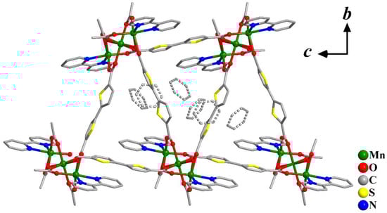 At a lower temperature (110 °C), the colorless block crystals of [Mn2(btdc)2(bpy)(dmf)]·0.5DMF (4) are isolated as a byproduct during the synthesis of Compound 1 with the reagent ratio [Mn2+]:[btdc2-]:[bpy] = 2:2:1. According to X-ray crystallography data, an asymmetric unit of 4 contains two Mn(II) cations. The coordination environment of Mn(1) ion contains 5 oxygen atoms of 3 carboxylic groups and 2 nitrogen atoms of a bpy molecule. Two of three COO groups are coordinated in a bidentate manner with a short Mn–O bond and a longer Mn···O contact. Coordination number of Mn(1) could be described as 5 + 2. The Mn(1)–O bond lengths are in the range 2.113(2)–2.239(3) Å, Mn(1)···O contacts are 2.506(3) and 2.663(3) Å, and Mn(1)–N bond lengths are 2.228(3) Å and 2.234(3) Å. Mn(2) are in octahedral coordination environment, which consists of 5 oxygen atoms of 5 carboxylate groups, and one oxygen atom of a coordinated DMF molecule disordered over four positions. Mn(2)–O distances are in the range 2.086(3)–2.227(3) Å. Mn(1) and Mn(2) cations are interconnected via 3 bridging COO-groups to form a binuclear unit. Two binuclear units are interconnected via two bridging carboxylic groups to form a tetranuclear building unit {Mn4(μ-RCOO-κ1,κ1)4(μ-RCOO-κ1,κ2)4(bpy)2(dmf)2} (Figure 4a). The thiophene rings of a half btdc2− anions are in the cis positions, whereas those of another half btdc2− anions are in the trans positions. Each tetranuclear SBU is connected by four double btdc2− bridges to four neighboring ones, which leads to the formation of wide layers (Figure 4b) parallel to the bc plane. The layers alternate along the a axis to form the one-layered crystal packing. Compound 4 has triangular channels of the size of 5 × 8 Å running along the a axis. The channels are occupied by disordered coordinated and guest DMF molecules. The guest-accessible void volume of 4 estimated using PLATON software [27] is only 7%.