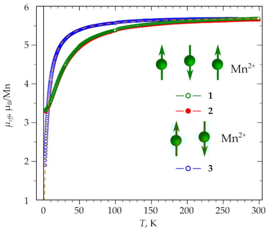 In the high-temperature region, the effective magnetic moments of all Compounds 1–3 reach similar values of 5.65–5.69 μB per manganese ion (Figure 11), which are very close to the μeff ≈ 5.92 μB expected for isolated Mn2+ ions (S = 5/2, L = 0), especially if the AF interaction within dimers and trimers still slightly affecting the magnetic susceptibility at high T is taken into account. Given that Mn2+ ions have no orbital moments (L = 0), the effects associated with the contribution of orbital moments and with zero-field splitting that usually affect the magnetic susceptibility behavior are expected to be rather weak in the compounds studied. This justifies the above description where the temperature dependences of μeff were attributed solely to the AF interactions within trinuclear (1 and 2) and binuclear (3) SBUs.