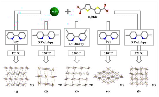 All compounds are formed under similar reaction conditions: manganese(II) perchlorate hexahydrate as a source of the metal ions, the equimolar ratio of the metal ions and H2btdc, DMF as a solvent, and high synthesis temperature (110–130 °C) (Scheme 1). The syntheses of Compounds 1–3, which have been obtained as pure phases, are reproducible with comparable yields (46–61%). Compounds 4 and 5 were obtained as impurities to Compounds 1 and 2, respectively, when trying to synthesize them under other conditions.