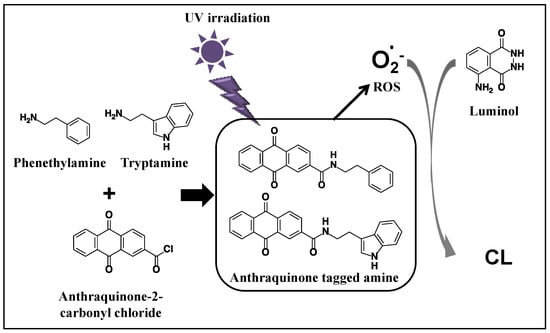 Despite the described excellent advantages of CL detection, until now, no selective chemiluminogenic reagents for biogenic amines have been developed. Therefore, herein, we report a new CL derivatization strategy for the HPLC-CL determination of typical amines through derivatization with anthraquinone-2-carbonyl chloride, as seen in Figure 1. The typical biogenic amines tryptamine and phenethylamine were derivatized with anthraquinone-2-carbonyl chloride and then injected into an HPLC-CL system equipped with an online photoreactor. The anthraquinone-tagged amines are separated, and then UV-irradiated in the photoreactor, and consequently, ROS are generated. Next, chemiluminescence is produced by the online reaction of the generated ROS with luminol. Finally, the developed method was applied to the determination of amines in wine samples.