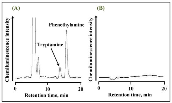 Chromatograms of 10 µM standard solution of tryptamine and phenethylamine after derivatization with anthraquinone-2-carbonyl chloride obtained (A) with and (B) without UV irradiation.