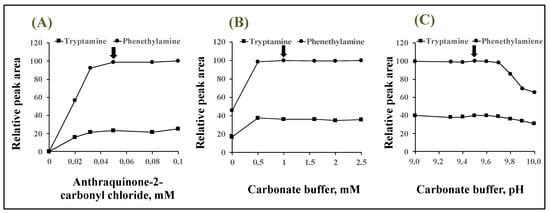 Effects of (A) anthraquinone-2-carbonyl chloride concentration, (B) carbonate buffer concentration, and (C) buffer pH on the peak area of derivative. Arrows indicate optimum conditions.