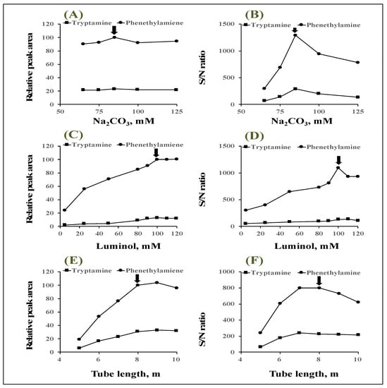 Effects of sodium carbonate concentration on (A) relative peak area and (B) S/N ratio. Effects of luminol concentration on (C) relative peak area and (D) S/N ratio. Effects of tube length of photoreactor on (E) relative peak area and (F) S/N ratio.