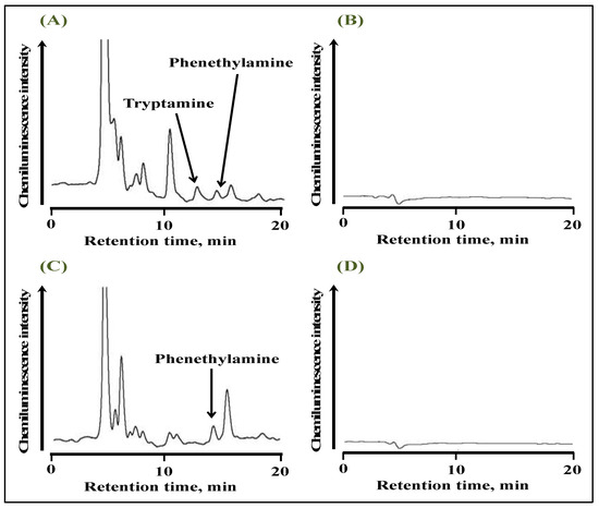 The % recoveries were found to be 92 and 88 % for tryptamine and phenethylamine, respectively. Red and white wines were extracted using SALLE prior to their derivatization with anthraquinone-2-carbonyl chloride, and the typical chromatograms are shown in Figure 6. Both tryptamine and phenethylamine were detected in red wine (Figure 6A), while only phenethylamine was detected in white wine (Figure 6C). The peaks detected on the chromatogram, including tryptamine and phenethylamine, disappeared in the absence of UV irradiation (Figure 6B,D). Therefore, these peaks could be attributed to wine components derivatized with anthraquinone-2-carbonyl chloride. The concentrations of tryptamine and phenethylamine in wine samples quantified by the standard addition method are summarized in Table 4, and these values were in good agreement with those of previously reported studies [32,33].