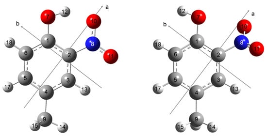 Molecular structures of the two conformers of 4-methyl-2-nitrophenol, 4MNP-1 (left) and 4MNP-2 (right). The carbon atoms are gray, hydrogen atoms white, oxygen atoms red, and the nitrogen atom is blue. The principal inertial axes a, b are indicated. The c-axis is perpendicular to the ab plane.