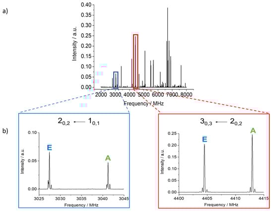 4MNP-1 is predicted to be a planar molecule with only µa and µb dipole moment components. Because µa is predicted to be much larger than µb, we initially looked for R-branch a-type transitions. A series of intense lines separated by approximately B + C and following the expected pattern for aR transitions was observed in the broadband rotational spectrum. They all showed nuclear quadrupole coupling splittings arising from the 14N nucleus. Each rotational transition was also split into A and E components (see Figure 4) arising from the interaction between the methyl internal rotation and the overall rotation of the molecule. The hydrogen bond between the hydroxyl and nitro groups in 4MNP-1 impedes the rotation of the –OH group, hence there is no splitting due to this motion. From initial fits of the A torsional components of a-type transitions using Pickett’s spfit program [54] and Watson’s S-reduced Hamiltonian [55], preliminary rotational constants were determined and further a-type and b-type transitions were assigned. Many of the most intense quadrupole hyperfine components were blended in the broadband rotational spectrum. Therefore, further measurements were performed, taking advantage of the higher resolution of the Fabry–Pérot Fourier transform microwave (FTMW) spectrometer (Figure 5). A total of 327 a- and b-type lines combining A and E transitions with fully resolved nuclear quadrupole coupling splittings were measured, with an estimated measurement accuracy of 4 kHz.