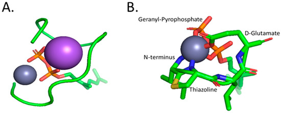 (A) The full complex of Zinc coordination with the geranyl-pyrophosphate ligand, represented in red (oxygen), orange (phosphorus), and green for the geranyl chain, and bacitracin displayed in a green ribbon representation. Sodium and Zinc are represented as the large purple sphere and small grey sphere, respectively. The sodium ion found within the complex is thought to neutralize the pyrophosphate charge and bridge oxygen atoms from the pyrophosphate and C-terminal of Bacitracin. (B) A zoomed-in depiction of the inner-sphere coordination of Zinc with the N-terminal amine, amino acids, D-Glu4 and thiazoline, oxygens from the geranyl-pyrophosphate, and an unrepresented water molecule. All structures were generated in PyMOL [52].