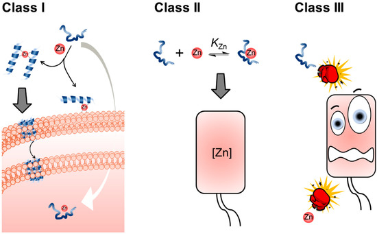 The three different classes of AMP and Zn(II) ion interactions. In Class I, an AMP-Zn(II) complex has a deleterious effect on cells. The Zn(II) complex does not need to be formed by a 1:1 metal ion peptide ratio, the only requisite is that a coordinate bond is formed. In Class II, intracellular Zn(II) availability is controlled by the presence of the AMP. Finally, in Class III, the two antimicrobial effectors do not form a coordination bond at any stage of the process; however, they still help each other resulting in a synergistic effect.