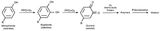 The biological and chemical properties of PPO have been studied for more than a century, since 1896 [11]. Most of the PPO in plants is found in the plastids, such as the chloroplasts of photosynthetic cells and the leucoplasts of storage cells, etc., and is relatively more abundant in young tissues. Based on substrate specificity and action mode, scientists usually divide PPO into tyrosinase (EC 1.14.18.1), catechol oxidase (EC 1.10.3.1), and laccase (EC 1.10.3.2) [12,13]. PPO catalyzed two important reactions: the monophenol is hydroxylated to o-diphenol, and o-diphenol is oxidized to o-quinone [14]. Then, o-quinone was further polymerized and condensed with amino acids and proteins to produce brown substances (Figure 1) [15,16]. The activity of PPO conforms to the parabolic law at different pHs, with the highest activity and the strongest catalytic activity at the optimum pH. Multiple optimum pH of PPO had been confirmed in plants depends on its substrate and original species. Furthermore, the pH optimum of most PPO was range from 5.0 to 8.0. Besides pH optima, temperature also plays a vital role in PPO activity. PPOs in different plant species showed varied optimum temperatures; most of them were in the range of 30–50 °C. PPO with the highest catalytic activity at the optimum pH and temperature [2,14].