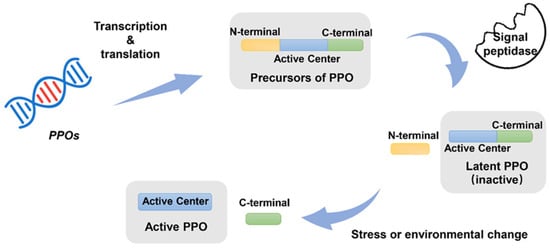 The precursor of PPO was synthesized from PPO genes. Then, the N-terminal transit peptide sequence would be removed, and a mature latent PPO (inactive) would be generated in the plastid. PPO is activated (active PPO) by cleavage of its C-terminal by a protease under stress or environmental change.