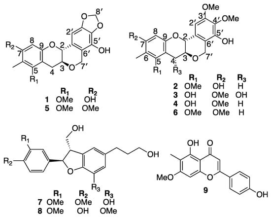 - Ngnokam, D.; Massiot, G.; Nuzillard, J.M.; Tsamo, E. (+)-7′, 7′-Dimethyl-5-hydroxy-2R, 3S-trans-pubeschin from Entandrophragma cylindricum. Phytochemistry 1994, 37, 529–531. [Google Scholar] [CrossRef]